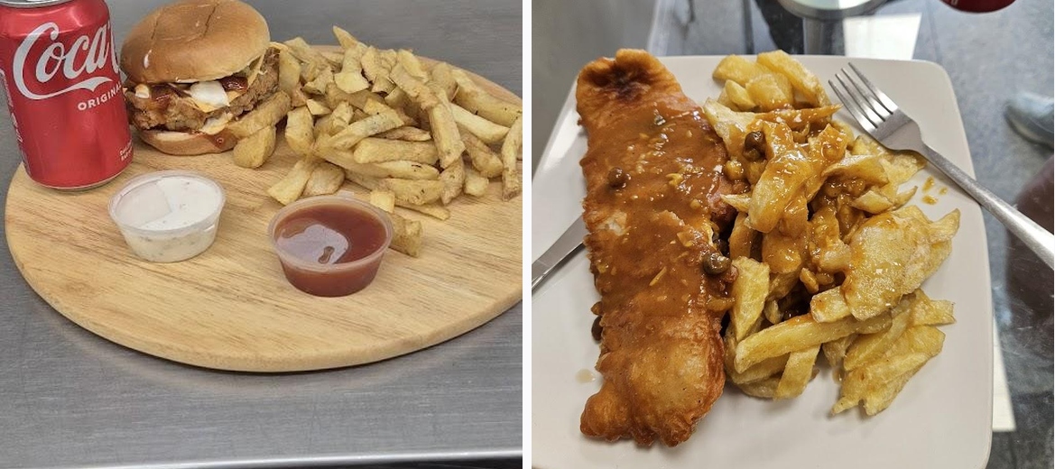 You can indulge in a variety of dishes at Langdale Fisheries, including fish and chips, burgers, and grilled kebabs, among others.